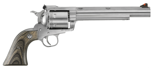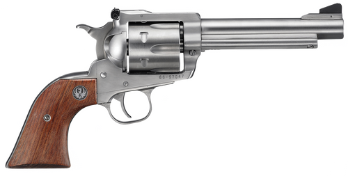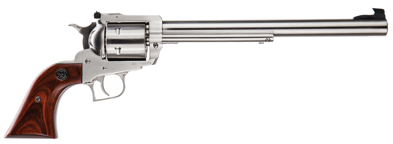 Single-action revolver chambered in 44 Rem Mag (also accepts 44 Special), featuring a 10.5" cold hammer-forged barrel with satin stainless steel finish. The unfluted cylinder, adjustable rear sight with ramp front sight, hardwood grips, and patented transfer bar safety provide reliable performance. Weighs 55 oz with an overall length of 16.38-16.5 inches.