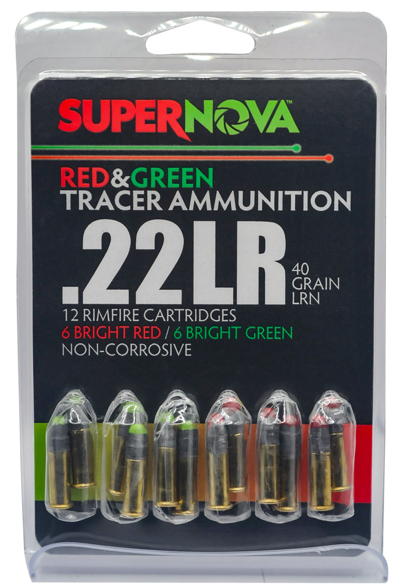 Supernova Green/Red Tracer ammunition in 22 LR caliber features a 40-grain lead round nose bullet designed for range shooting and target practice. This combo pack includes 6 rounds with green tracer and 6 rounds with red tracer per box, offering visual feedback for shot placement. Rounds are sold 12 per box with 60 boxes per case.