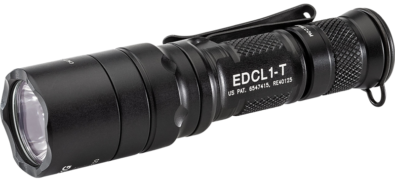 The SureFire EDCL1-T is a dual-output tactical flashlight delivering 500 lumens on high and 5 lumens on low, powered by a single CR123A battery. It features a Total Internal Reflection lens for versatile beam projection with 175 meters of throw distance, IPX-7 waterproofing, and a tail cap push-button switch. Constructed from anodized aluminum, it weighs 3.3 oz and measures 4.5" in overall length.
