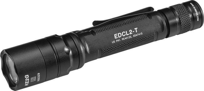 The SureFire EDCL2-T is a dual-output handheld flashlight that delivers 1,200 lumens on high and 5 lumens on low through a Total Internal Reflection (TIR) lens. It features an aluminum body with black anodized finish, operates on two CR123A batteries with approximately 1 hour runtime, and is rated IPX-7 waterproof. Designed for everyday carry with medium to long-range illumination capabilities and a maximum intensity of 11,300 candela.