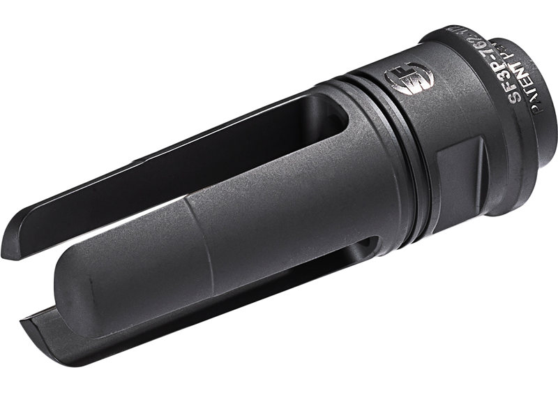 SureFire's SF3P three-prong flash hider for 7.62mm/.308 rifles reduces muzzle flash by more than 99% using a patented design. Precision-machined from heat-treated stainless steel and DLC-coated for erosion resistance, it features 5/8"-24 thread pitch and 2.60" overall length. Quick-detachable attachment method allows easy installation and removal on compatible AR-10 and .308 platforms.