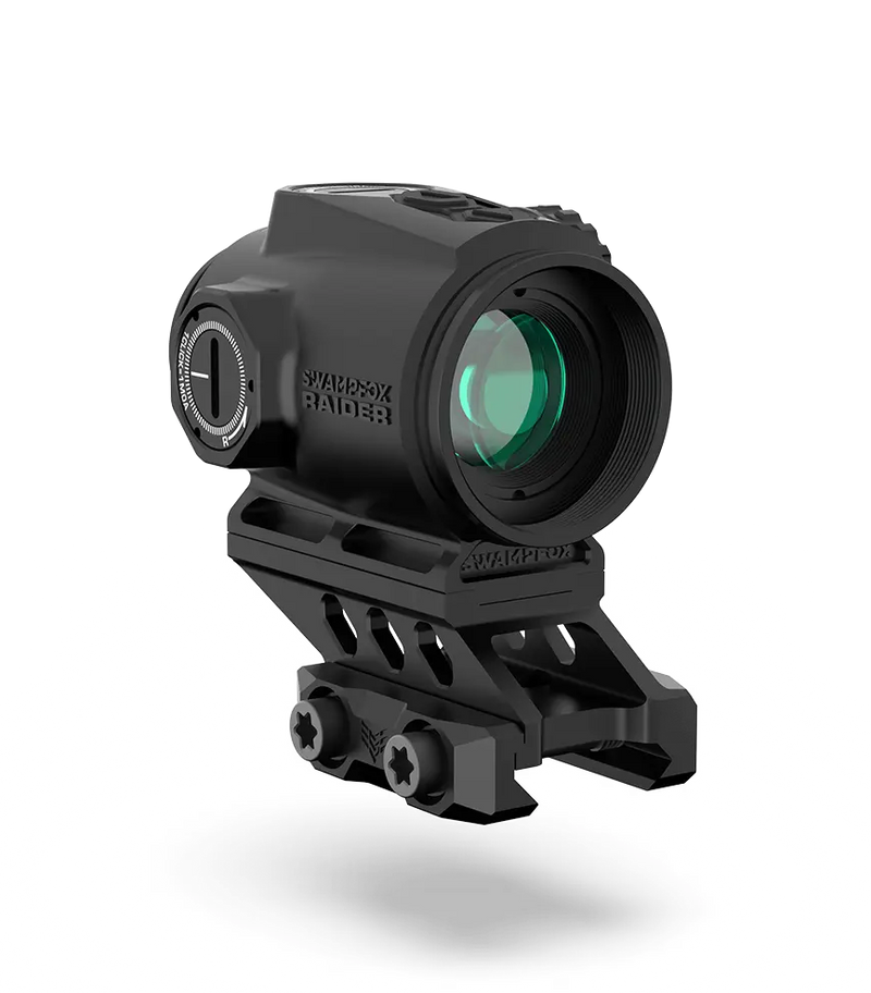 The Raider is a 1x magnification micro prism sight with a 20mm objective lens featuring either Bullet Rise Compensation (BRC) or 6 MOA green dot etched reticle technology. This illuminated optic offers 3.54" of eye relief, IPX-7 waterproof rating, and a T-2 footprint for versatile mounting on modern platforms. The die-cast zinc alloy body provides robust durability with fully multi-coated optics and parallax-free performance to 100 yards.