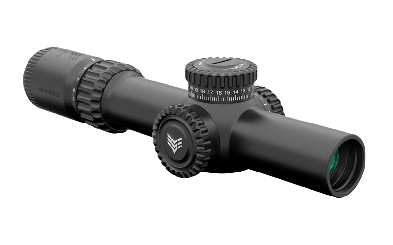 The Swampfox Warhorse 1-6x24 is a first focal plane riflescope featuring a red MOA reticle for precise aiming across variable magnification ranges. Designed for tactical and hunting applications, this scope provides versatility from close-quarters to mid-range engagements. The FFP design ensures reticle measurements remain consistent regardless of magnification setting.