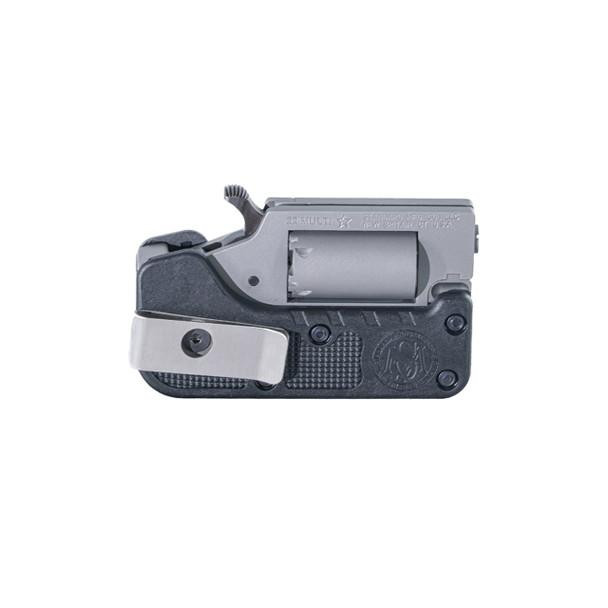 Single-action folding revolver chambered in .22 WMR with a 0.75" barrel and 5-round capacity. Features a CNC-machined stainless steel frame and barrel with large polymer grip and integral belt clip. Weighs 9 ounces loaded with compact folded dimensions of 2.125" x 3.75" x 0.75".