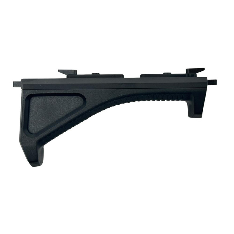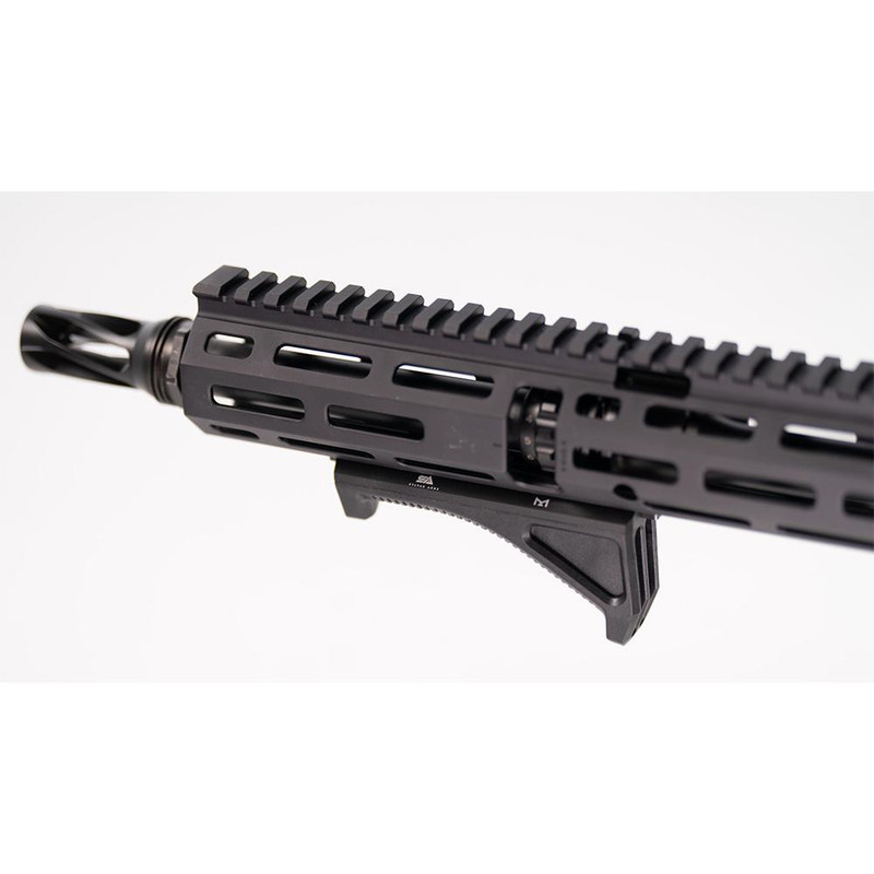 Quick-detach angled foregrip for M-LOK compliant handguards, constructed from 6061-T6 aluminum and PA66 fiberglass. Installs without tools in seconds and weighs 2.7 oz. Compatible with AR-15 platforms for rapid tactical adjustments and range transitions.