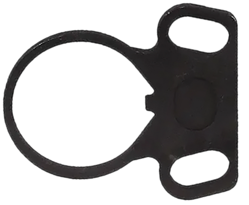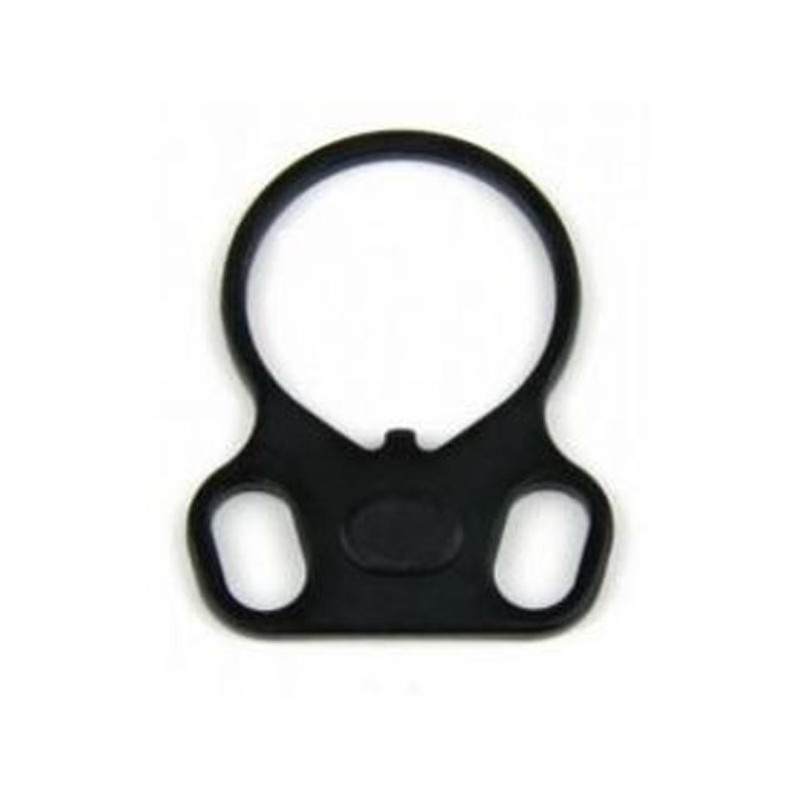 Steel receiver end plate designed for AR-15 rifles with dual oval loop sling attachment points for ambidextrous carry options. Features black nitride finish for durability and requires no gunsmithing for installation. Replaces factory end plate and allows sling attachment from either side to prevent snagging.