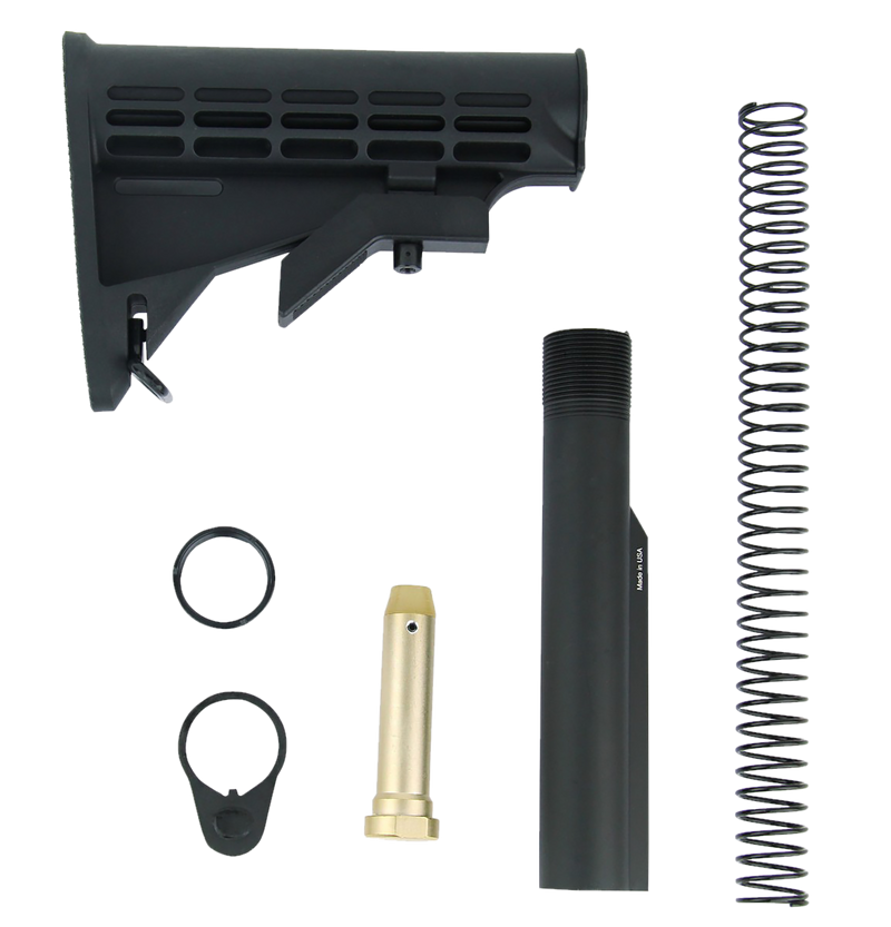This mil-spec M4 stock kit is fully compatible with AR-15 platforms and includes a 6-position buffer tube, M4-style stock, 3 oz. buffer, carbine-length buffer spring, end plate, and castle nut. Constructed from steel, aluminum, and polymer materials, it provides tool-free adjustability for length of pull and is designed for standard mil-spec installations.