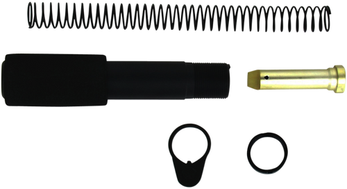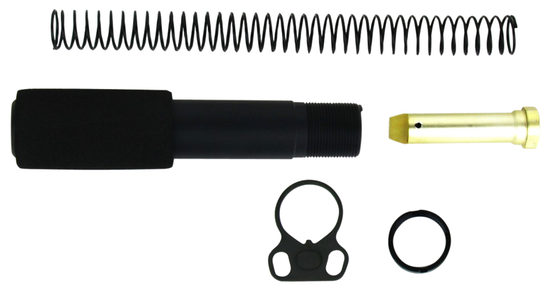 This Mil-Spec buffer tube kit for AR-15 pistol platforms includes a pistol buffer tube with foam insert, 3 oz. buffer, carbine length buffer spring, dual loop sling adapter end plate, and castle nut. The kit features anodized aluminum construction and is compatible with AR-15 platforms chambered in .223 Remington/5.56 NATO. Installation requires basic AR-15 assembly knowledge and standard tools.