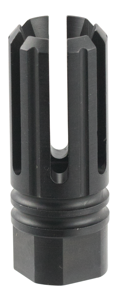 The TacFire MZ1005N is a 6-prong flash hider designed for 5.56x45mm NATO AR-platform rifles, featuring black nitride steel construction with a 2.22" overall length. It threads onto barrels with 1/2"-28 tpi pitch and helps reduce muzzle flash during firing. The prong design provides effective flash reduction while maintaining a compact profile.