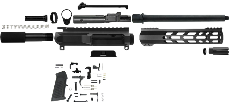 This TacFire pistol kit is a complete build package chambered in 45 ACP, constructed from black steel components. The kit includes all necessary parts for pistol assembly, with overall dimensions of 16.2" length, 5.8" width, and 5.5" height.