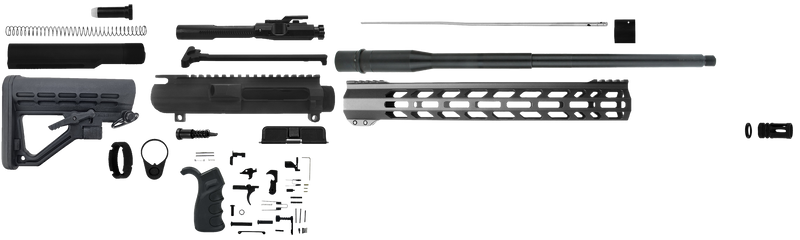 This is a complete AR-10 build kit chambered in .308 Winchester, featuring black nitride finish on critical components and a 5/8"x24 threaded muzzle. The kit includes aluminum construction throughout and is designed for semi-automatic operation. All necessary components are included for assembly into a functional AR-10 platform rifle.