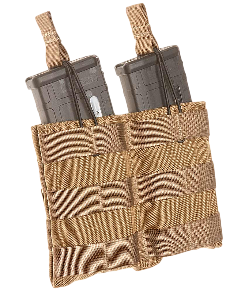 Double rifle magazine pouch constructed with durable 1000 Denier Nylon and designed for fast magazine reloading. Features elastic cord retention with pull tabs and blackened grommets for drainage. Mounts via MOLLE attachment system.