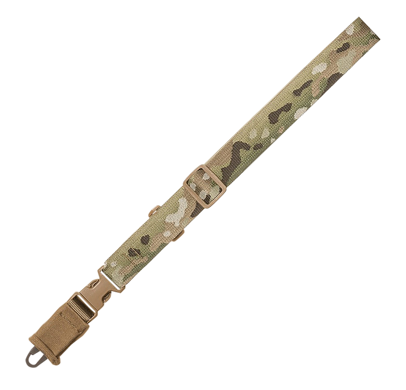 Single-point tactical sling designed for rifles and shotguns, featuring MultiCam webbing with HK-style hook attachment and hardware included. The 1.5-inch width webbing construction provides durability and comfort for CQB applications. Adjustable length accommodates various shooter preferences and equipment configurations.