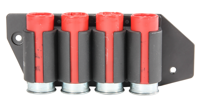 The TacStar SideSaddle is a 4-round shotshell carrier designed to mount on Mossberg 500/590 12-gauge shotguns via the receiver. Constructed from black polymer with an aluminum mounting plate, it provides secure ammo storage and quick access to additional rounds during operation.