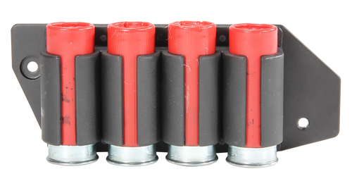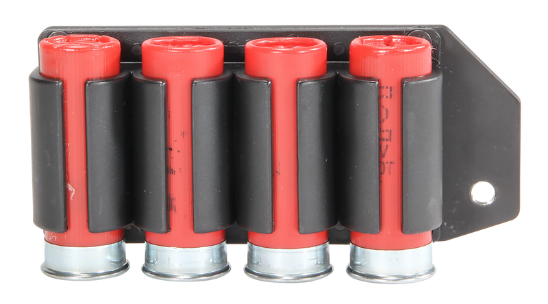 The TacStar SideSaddle is a 4-round shotshell carrier designed for Remington 870/1100/1187 12-gauge shotguns. It mounts directly to the receiver side with included hardware and requires no gun modifications. The polymer construction with aluminum mounting plate keeps extra shells secure and accessible for quick reloading during hunting or sport shooting.