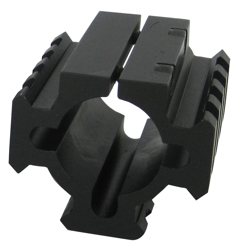 TacStar Shotgun Rail Mount is a single-piece Picatinny-style rail system designed to fit standard 1" diameter magazine extensions on shotguns. Features three Picatinny rails positioned 90 degrees apart for versatile accessory mounting including tactical lights and lasers. Easy-to-install clamping system provides secure mounting without marring extensions.