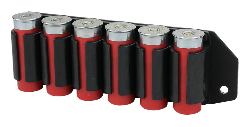 The TacStar SideSaddle is a 6-round shotshell carrier that mounts directly to the receiver of Mossberg 500/590 12-gauge shotguns for quick access during reloading. Constructed from weatherproof black polymer with an aluminum mounting plate, it installs without gunsmithing and includes all necessary mounting hardware. The carrier positions ammunition conveniently on the side of the shotgun while maintaining clear sight lines.