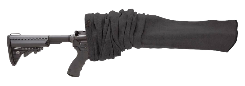 Silicone-treated knit gun sock designed to fit tactical rifles and shotguns with or without scopes, accommodating firearms up to 55 inches in length. Features a cinch closure for secure retention and protection during storage and transport. Ideal for safely housing rifles and shotguns in a compact, portable format.