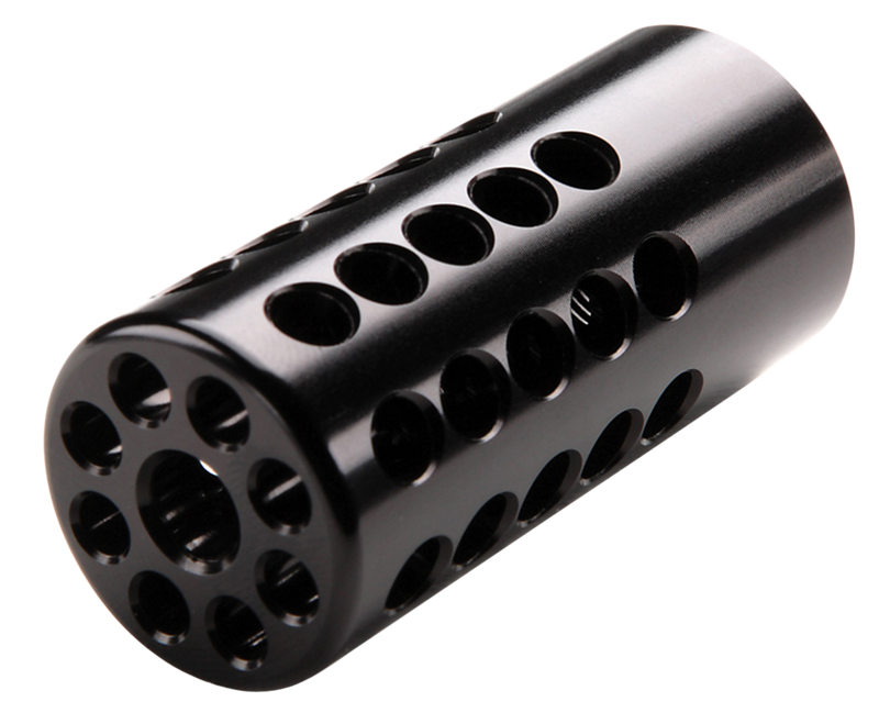 The X-Ring Compensator is a muzzle device designed for Ruger 10/22 rifles chambered in .22 LR, featuring 360-degree porting to help reduce muzzle rise. Constructed from black gloss aluminum with 1/2"-28 tpi threads and a .920" diameter, it installs directly onto compatible 10/22 barrels. This compensator enhances accuracy and control for .22 LR shooting applications.