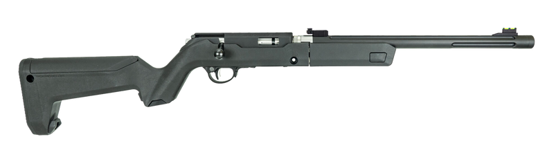 The Tactical Solutions Owyhee Takedown is a bolt-action 17 HMR rifle with a 16.5" threaded barrel and 9-round capacity, designed as a lightweight, compact, and collapsible platform. It features a black aluminum receiver, Magpul MOE X-22 synthetic stock, adjustable fiber optic sights, and a target crown muzzle. Weighing 4.3 lbs with an overall length of 34.25", this takedown rifle provides a quieter platform when suppressed compared to semi-automatic alternatives.