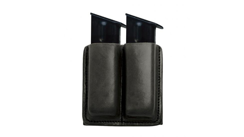 Ambidextrous double magazine carrier designed for 9mm magazines from Sig Sauer, Sigarms, Beretta, and Walther platforms. Constructed from leather with a limited lifetime manufacturer warranty. Suitable for organizing and carrying spare ammunition magazines.