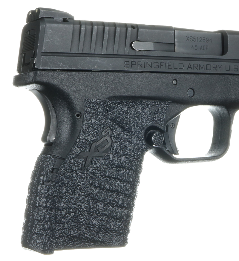 This adhesive grip is designed for the Springfield XD-S pistol in 9mm, .40, and .45 ACP with small backstrap. Constructed from textured black rubber material, it measures 8.0" in length and 4.2" in width for enhanced ergonomic control. Installation is adhesive-based, providing a secure and permanent grip enhancement without modification to the firearm.