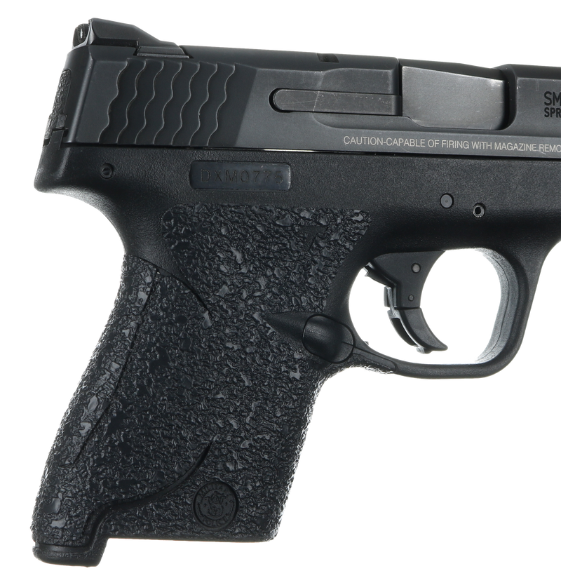 Adhesive-applied grip overlay made from textured black rubber, designed to enhance grip and control on the S&W M&P Shield 9mm and .40 S&W pistols. Dimensions are 8.3" long by 5.6" wide with 0.5" height profile. Installation is tool-free using the adhesive backing for a permanent, custom fit.