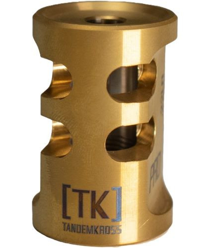 The Tandemkross Game Changer Pro is a compensator designed specifically for .22LR firearms, featuring a gold finish. This muzzle device helps manage recoil and muzzle rise for improved accuracy and control during shooting.
