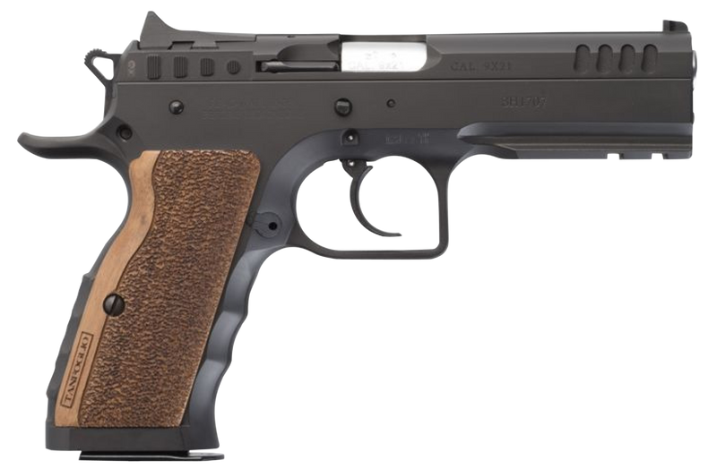 The Tanfoglio Defiant Stock I is a 9mm Luger semi-automatic pistol with a 4.5" barrel and 16+1 round capacity. It features a double-action-only trigger, steel frame and slide with black finish, serrated slide, contrast sights (blade front, adjustable rear), Picatinny rail, beavertail frame, and wood grips. Weighs 2.65 lbs with overall dimensions of 12.4" length x 8.5" width x 2.8" height.