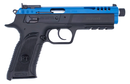 Tanfoglio Force Tactical chambered in .22 LR with a 4.40" threaded barrel and 10+1 capacity. Features a DA/SA action, serrated black slide, black polymer frame with beavertail grip safety and Picatinny rail for accessories. Dimensions: 12.4" length × 2.8" height × 8.5" width.