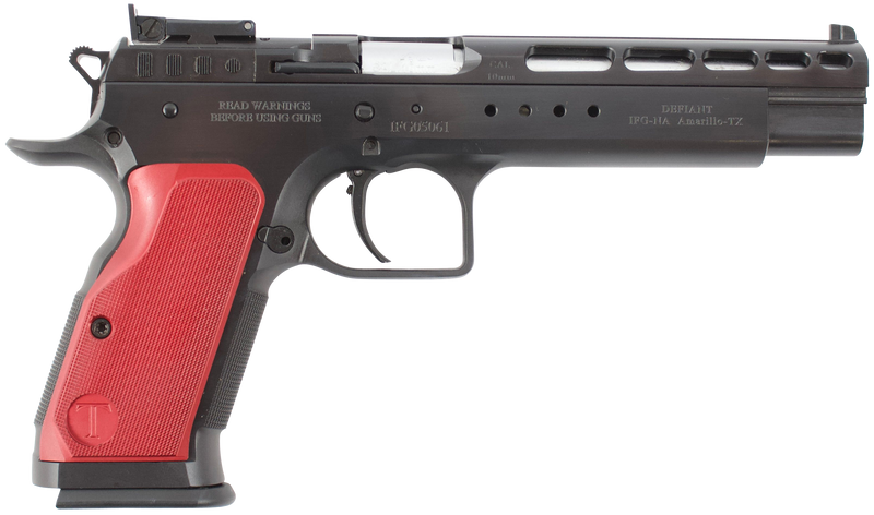 Tanfoglio Gold Match semi-automatic pistol chambered in 10mm Auto with a 6" blued polygonal rifled barrel and 14+1 round capacity. Features an optic-ready, ported and serrated blued steel slide with beavertail grip safety, adjustable Super Sight, and frame drilled for carry optics mounting.