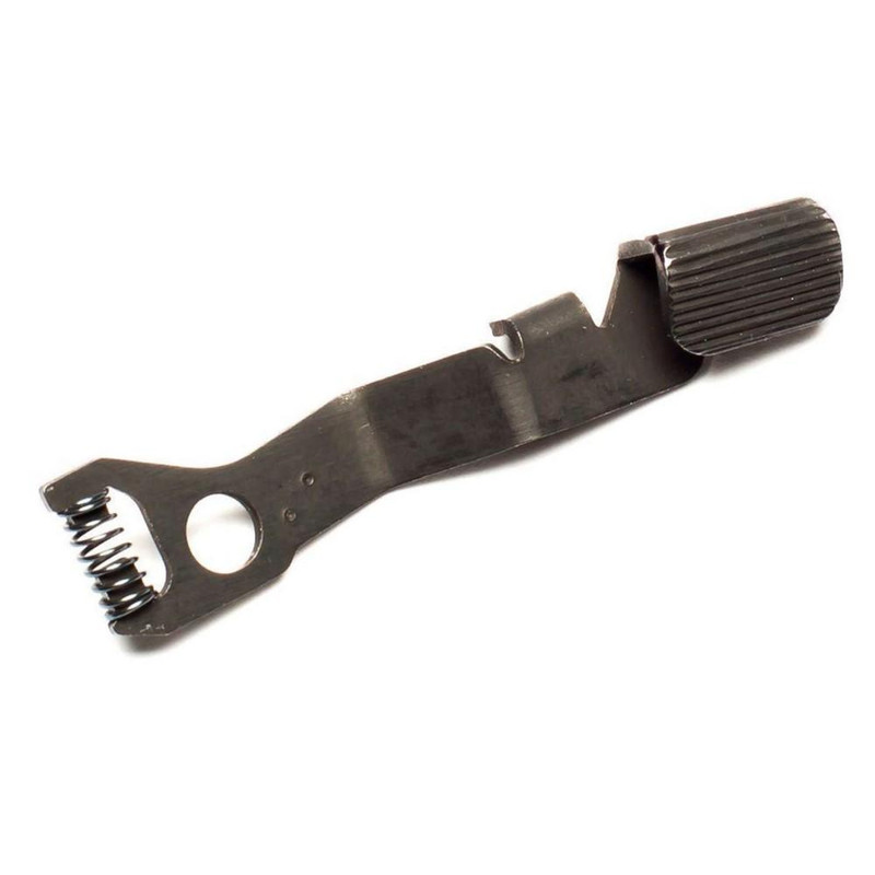 This is a Vickers Tactical slide stop designed for Glock 42 and 43 pistols, constructed from steel with a black oxide finish. The part addresses control ergonomics on compact handguns to improve reload reliability under stress.