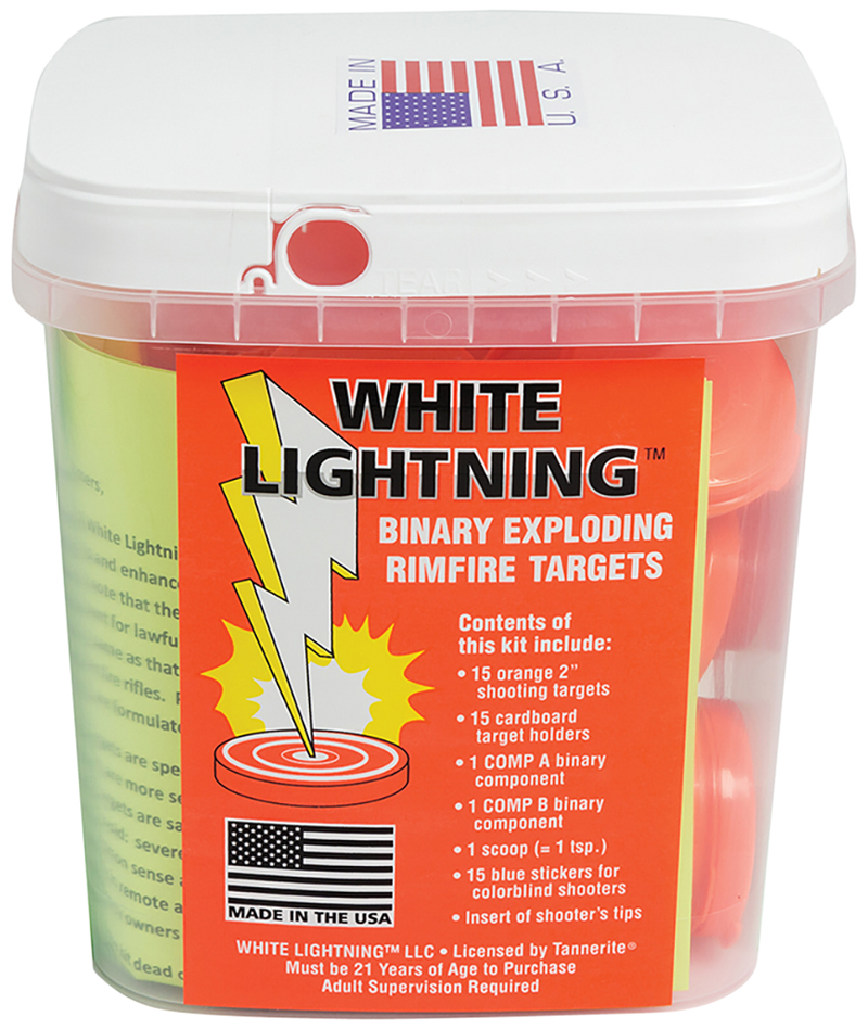 Tannerite White Lightning is an explosive target system designed for rimfire rifles that produces a visible white vapor explosion on impact. Each kit includes 15 targets with cardboard holders, hi-viz target dots, and catalyst. This is a reactive/exploding target product subject to hazmat regulations and state restrictions.