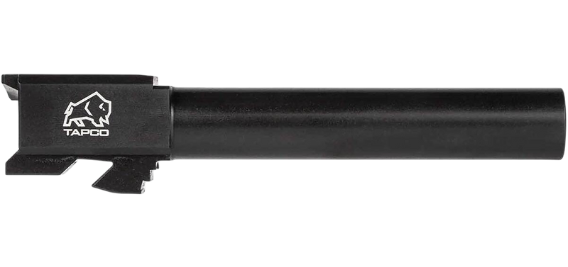 Tapco conversion barrel chambered in 9mm Luger for Glock 22 Gen 3-4 pistols. Features black nitride finish on stainless steel construction. Allows caliber conversion from .40 S&W to 9mm with simple barrel swap.