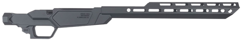 Tactical rifle stock designed specifically for the Henry Model X in .45-70 caliber with synthetic construction and black cerakote finish. Features an adjustable cheek rest and ambi universal ammo quiver for enhanced ergonomics and functionality. Direct-fit design for Henry Model X platform with no modifications required.