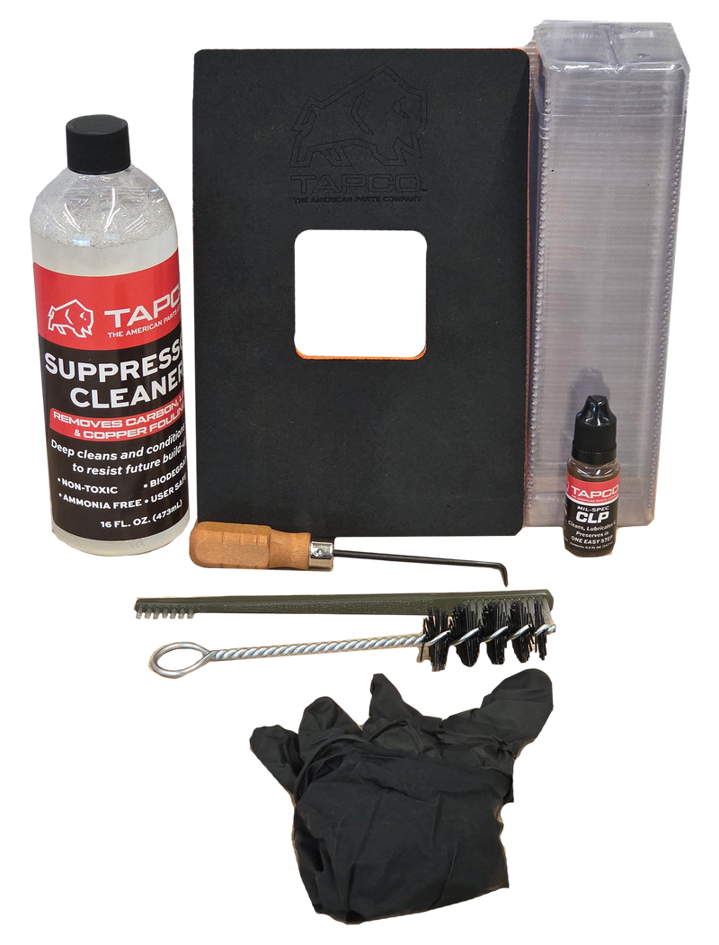 This suppressor cleaning kit from Tapco is designed specifically for cleaning and maintaining firearm suppressors. The kit includes essential cleaning components packaged in a compact case measuring 10.8" x 6.8" x 3.1". Ideal for shooters who use suppressed firearms and need to maintain their equipment.