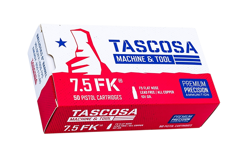 FK BRNO F9 ammunition in 7.5 FK caliber loaded with 101 grain all-copper monolithic flat nose bullets. Designed for defensive use and medium game hunting, this round generates a wide and deep permanent wound channel with high dynamic shock effect. Delivered as 50 rounds per box, 12 boxes per case.