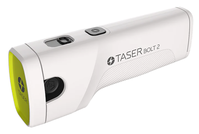 The TASER Bolt 2 is a less-lethal personal protection device with a 15-foot effective range and 30-second incapacitation capability using Neuromuscular Incapacitation (NMI) technology. It features a built-in laser and 210-lumen LED for targeting accuracy, weighs 8.4 ounces for everyday carry, and includes a backup contact stun mode for close-range defense.