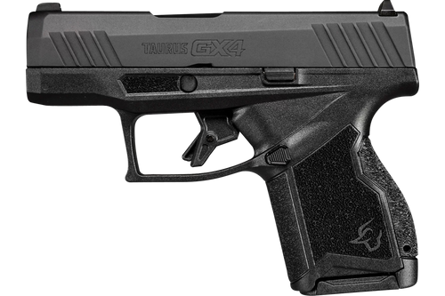 Taurus GX4 is a striker-fired, semi-automatic compact pistol chambered in 9mm Luger with a 3.06" barrel and 11+1 round capacity. Features include a serrated slide, adjustable rear sight, textured polymer grip with two backstrap options, striker block and trigger safety, and reversible magazine release. Includes two magazines and is suitable for concealed carry or home defense.