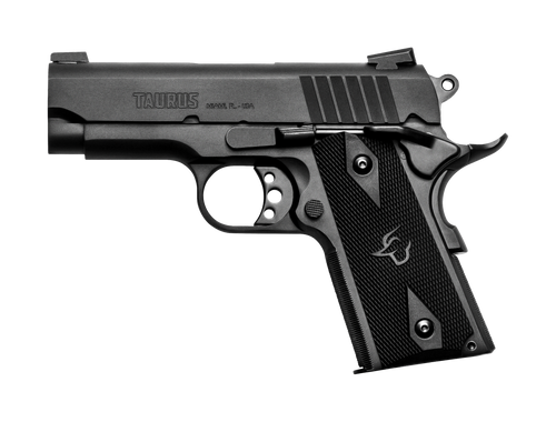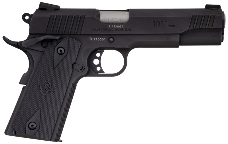 The Taurus 1911 is a single-action semi-automatic pistol chambered in 9mm Luger with a 5" steel barrel, matte black serrated slide, and steel frame with beavertail. This full-size 1911 features Novak-style adjustable sights, black checkered polymer grips, and a 9+1 round capacity, weighing 42 oz and designed for right-hand shooters.
