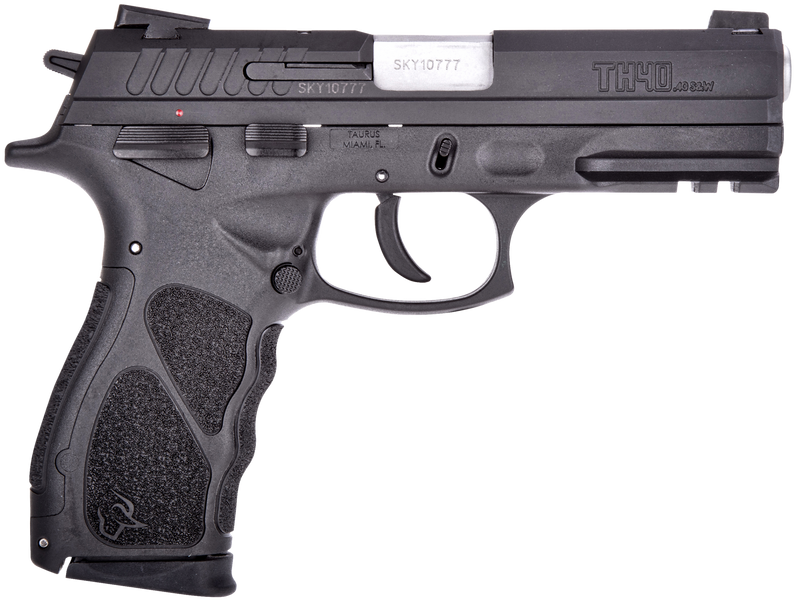 The Taurus TH40 is a DA/SA hammer-fired semi-auto pistol chambered in 40 S&W with a 4.27" barrel and 15+1 capacity. Built on a polymer frame with finger grooves, Picatinny rail, interchangeable backstraps, and Novak drift-adjustable sights. Weighs 24.7-28.2 oz with a matte black finish and matte stainless steel barrel.