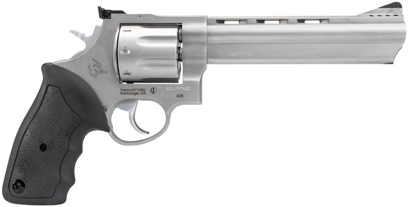 The Taurus 608 is a large-frame double/single-action revolver chambered in .357 Magnum/.38 Special +P with a 6.5" ported barrel and vent rib. It features adjustable rear sights, fixed front sight, exposed hammer, and black rubber grips with finger grooves, weighing 51 oz. The matte stainless steel finish and 8-round capacity make it suitable for personal protection and sport shooting applications.