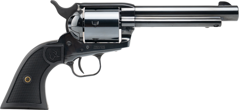 Single-action revolver chambered in 357 Magnum/9mm with dual cylinder capability, 5.5" barrel, and 6-round capacity. Features a steel frame with black finish, exposed hammer, transfer bar safety, and fixed blade front/rear sights. Weighs 2.6 lbs with an overall length of 11.04".