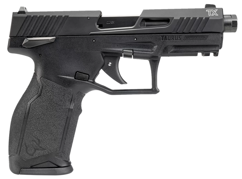 The Taurus 2TX22 is a .22 LR semi-auto pistol featuring a 4.6" threaded barrel and 10+1 round capacity. It has a polymer frame with Picatinny rail, fixed white dot front sight, drift adjustable rear sight, and manual striker block safety. Weight is 17.3 oz with overall length of 7.06".