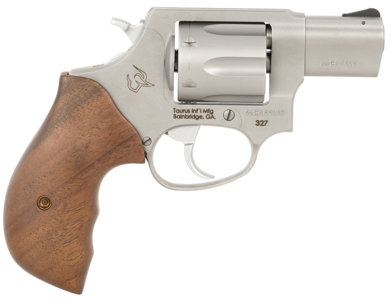 The Taurus 327 is a double-action/single-action revolver chambered in .327 Federal Magnum with a 2" matte stainless steel barrel and 6-round capacity. Features include a removable serrated front sight, fixed rear sight, Turkish walnut grip, and exposed hammer. This compact handgun weighs 22 oz with an overall length of 6.55".