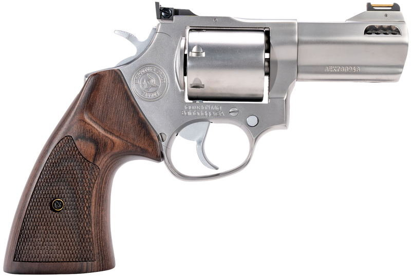 Double/Single Action revolver chambered in .357 Magnum/.38 Special with included 9mm cylinder and innovative switch-cylinder design for seamless caliber transitions. Features a 3" ported barrel, hand-polished stainless steel finish, custom checkered walnut grips, adjustable rear sights with brass insert front sight, and weighs 35 oz. Includes lockable hard case and custom hand-tuned trigger system.