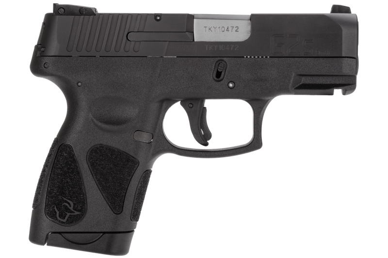 The Taurus G2S is a striker-fired semi-automatic compact pistol chambered in 9mm Luger with a 3.25" barrel and 7+1 round capacity. It features a matte black serrated alloy steel slide, black polymer frame with Picatinny rail, adjustable rear sights, and weighs approximately 20.25 oz unloaded. Designed for concealed carry and personal protection with an ergonomic slim profile.