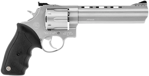The Taurus Raging Bull 444 is a double-action/single-action revolver chambered in .44 Magnum with a 6.5" ported barrel and 6-round capacity. Built with a matte stainless steel frame and cylinder, it features adjustable rear and fixed front sights, black rubber grips, and a transfer bar safety system. This large-frame revolver weighs 53 oz and is designed for hunting and personal protection with factory porting to reduce felt recoil.