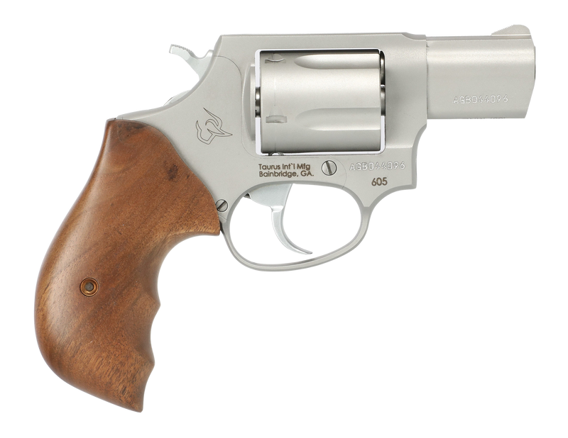 The Taurus 605 is a double/single action revolver chambered in .357 Magnum and .38 Special +P with a 2" barrel and 5-round capacity. Features a small steel frame with matte stainless finish, fixed sights, and walnut grips, weighing 24 oz. Ideal for concealed carry and personal protection.