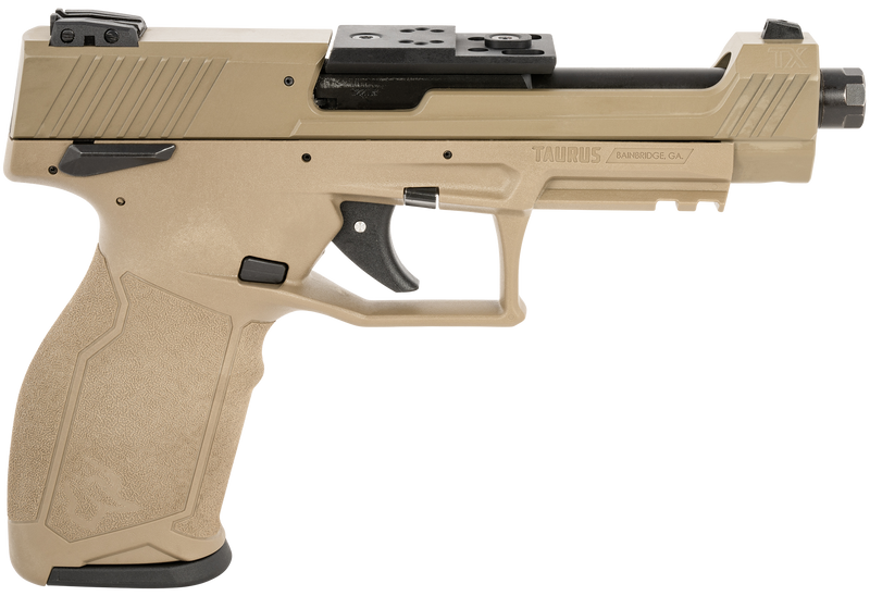 The Taurus TX22 Competition is a striker-fired semi-auto pistol chambered in .22 LR with a 5.25" threaded barrel and 16+1 round capacity. Features an optics-ready slide with mounting plate, adjustable 3-dot sights, FDE polymer frame and grips, ambidextrous safety, and Picatinny rail. Includes three 16-round magazines, soft case, and weighs 17.3 oz.